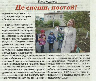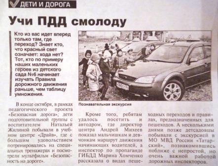 В "Народной газете" в статье "Учи ПДД смолоду" инспектор по пропаганде ГИБДД Марина Викторовна Хомченко осветила работу с детьми педагога МКДОУ - детского сада № 6 Натальи Александровны Жилиной по изучению ПДД. Марина Викторовна отмечает, что дети подготовительной группы побывали с познавательной экскурсией в учебном центре "Драйв", на автодроме и в МО МВД России "Татарский".